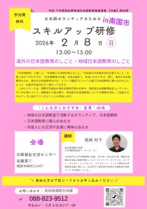 高知県(国際交流課)主催で2月8日(日)13時~15時に、南国市で「日本語ボランティアのためのスキルアップ研修in 南国市」が開催されます。