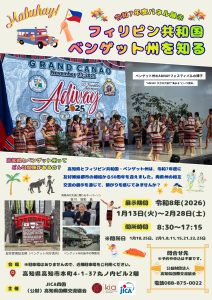 ◆内容:JICA 海外協力隊の初期隊員としてフィリピン共和国への派遣に始まり、両県州の相互交流におけるキーパーソンである『吉川 浩史』氏についてパネルでご紹介、高知県・ベンゲット州友好提携50 周年記念訪問団のご報告、民族衣装や品物の展示等を予定しています。