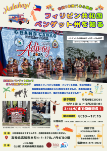 ◆内容:JICA 海外協力隊の初期隊員としてフィリピン共和国への派遣に始まり、両県州の相互交流におけるキーパーソンである『吉川 浩史』氏についてパネルでご紹介、高知県・ベンゲット州友好提携50 周年記念訪問団のご報告、民族衣装や品物の展示等を予定しています。